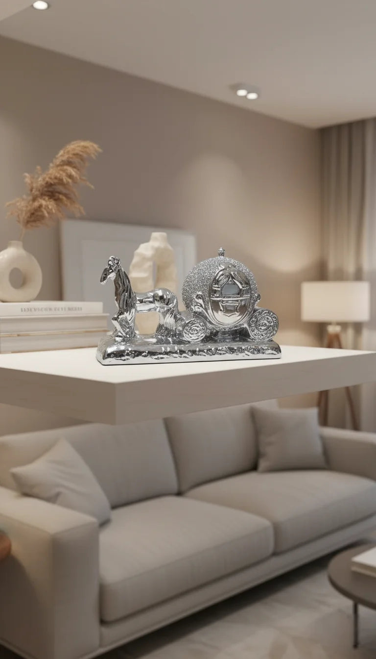 Elegant silver unicorn carriage ornament with crushed diamond sparkle, perfect for romantic décor, gifting, and shelf styling by Sparkle Decors.