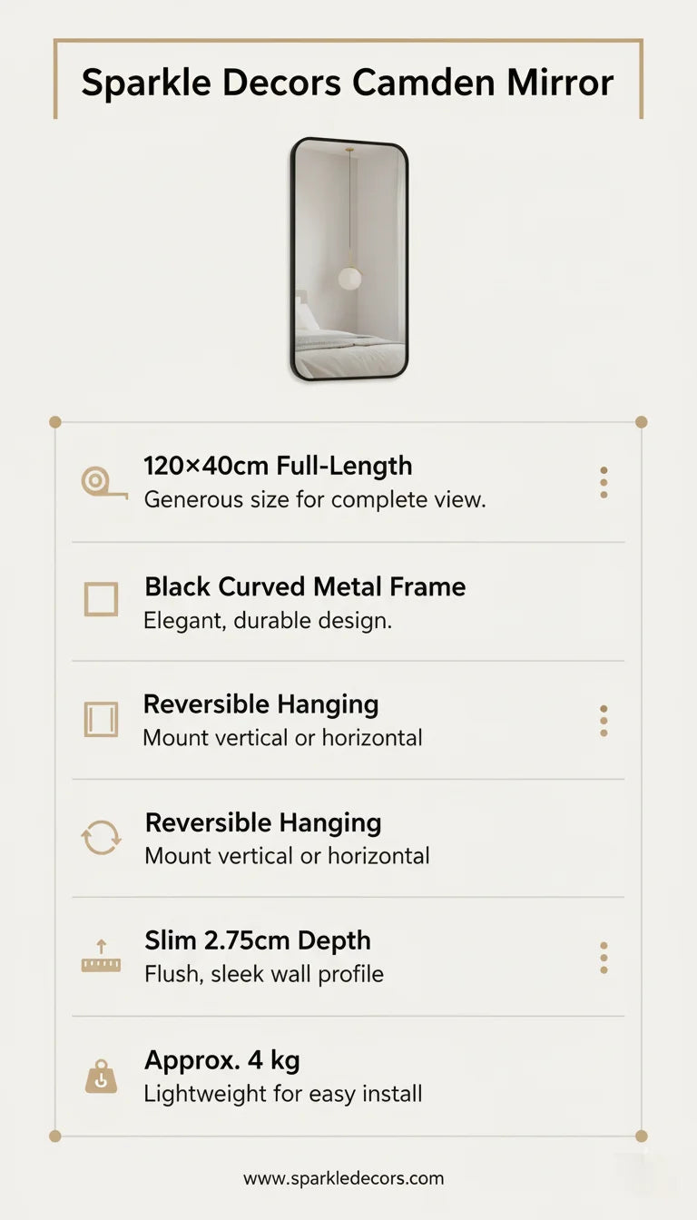 Sparkle Decors Camden Full-Length Black Curved Metal Wall Mirror 120x40cm - Modern Aluminum Frame